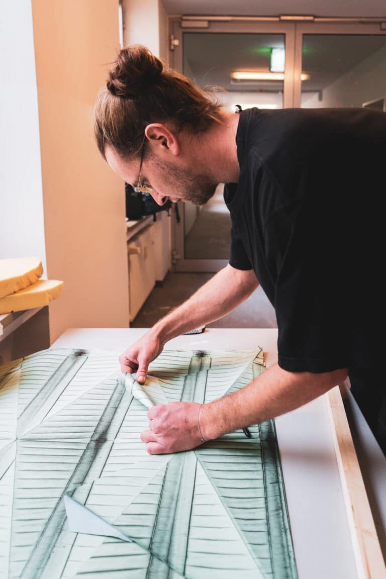 Die Transponierung der Farbe und der Struktur des kristallin gefalteten Daches in den Innenraum des Gebäudes in Form einer Tapete, aus der sich plastische Regalelemente entwickeln, versucht einen neuen Blick (welcher nicht zuletzt durch Drohnenflüge entsteht) auf dieses besondere Gebäudemerkmal zu lenken und daraus einen experimentellen Innenraum zu entwickeln.