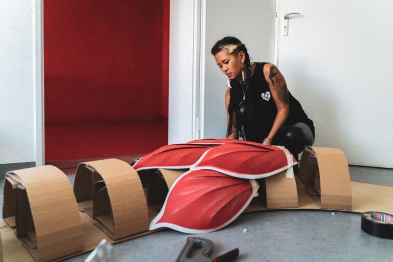 Die Künstlerin errichtet überall auf der Welt verteilt Installationen mit Körperteilen eines Drachens. Wenn du dich im Raum mit einem dieser Teile befindest, bist du somit auch mit den anderen Orten und Menschen verbunden. München, Tulum, Wuhan, Neuseeland … die Kreatur repräsentiert eine kollektive Heilung.