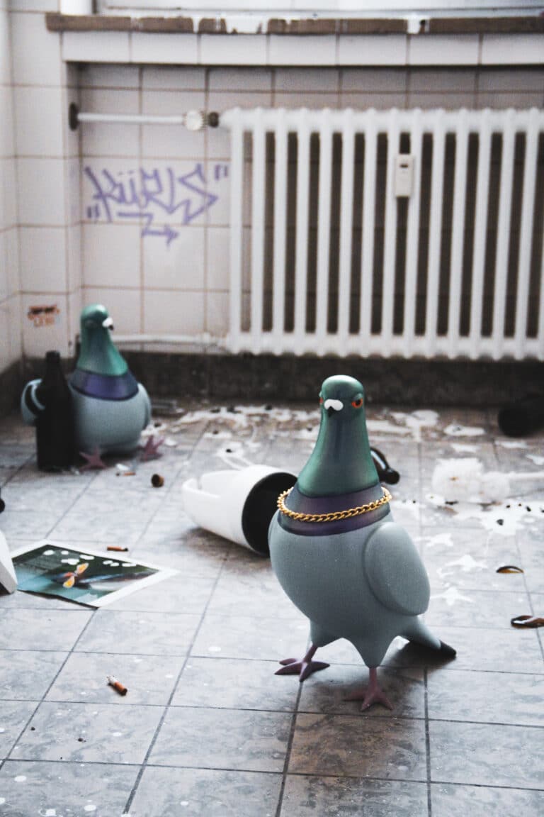 Oh, oh! Die größte Straßengang der Stadt hat sich einen Raum im Kunstlabor 2 unter den Nagel gerissen und feiert seitdem eine never ending Party. Bitte Vorsicht beim Betreten der Kabinen und die Tauben nicht füttern!