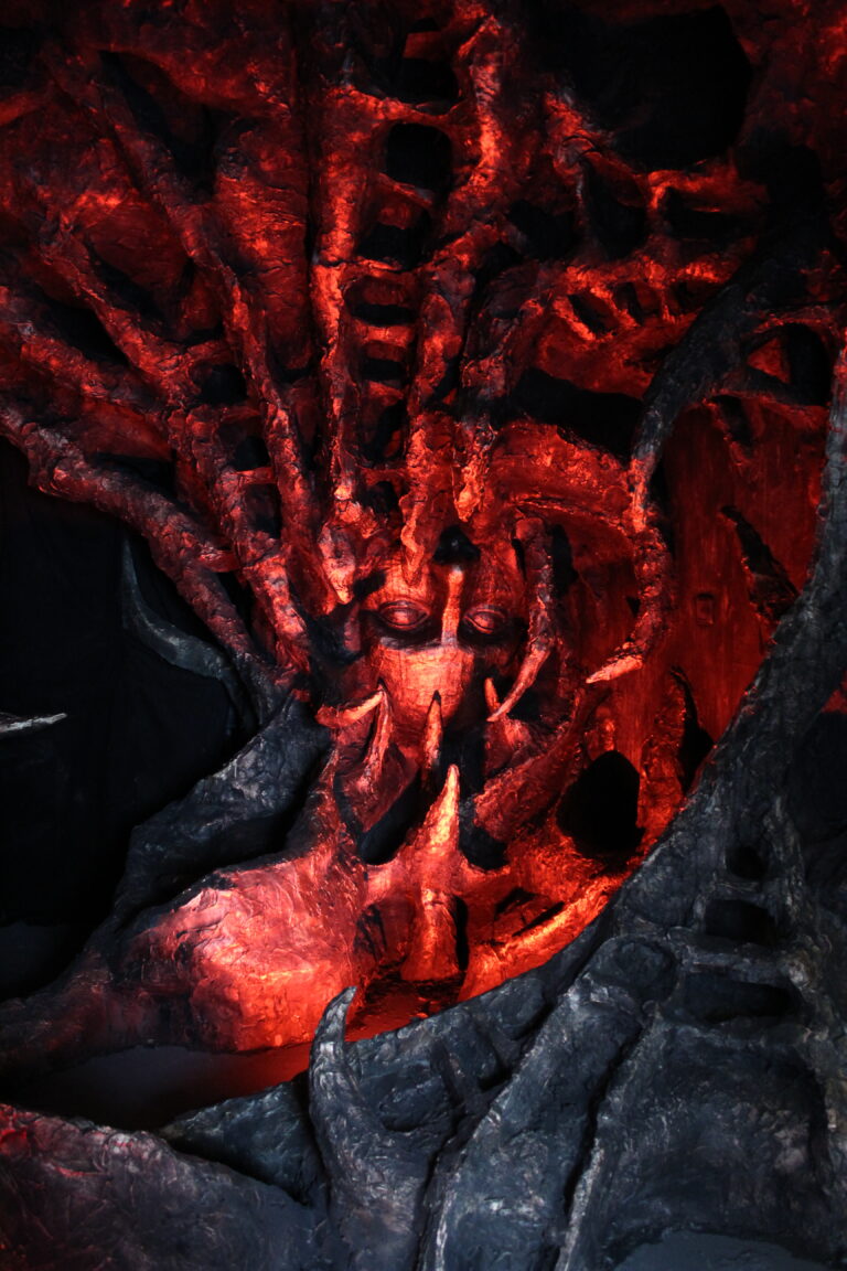 Tiamat – Urchaos und Schöpfung – Der Ausstellungsraum Tiamat lädt Besucher in eine immersive, skulpturale Installation ein, die von babylonischen und sumerischen Schöpfungsmythen inspiriert ist. Dunkle, Kupfer/Goldfarbene Töne dominieren den Raum, dessen organisch-anatomische Formen eine Symbiose aus Bedrohung und Anmut erschaffen. Die Atmosphäre wirkt gleichzeitig verstörend und faszinierend. Im Mittelpunkt steht die Figur Tiamat, zentrale Gestalt des babylonischen Enuma Eliš. Als Verkörperung des Urchaos und der lebensspendenden Urgewässer symbolisiert sie die Dualität von Schöpfung und Zerstörung. Diese Gegensätze spiegeln sich in der Gestaltung wider: kraftvolle, bedrohliche Strukturen verschmelzen mit fließenden, fast zarten Elementen und erzeugen eine spannungsgeladene Harmonie. Die Installation lässt die archaische Symbolik von Chaos und Schöpfung greifbar werden und regt zur Reflexion über die Ambivalenz von Schönheit und Gefahr an.