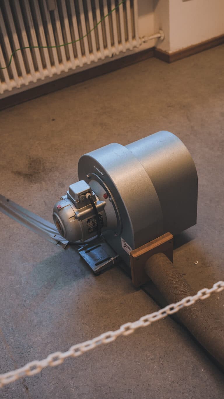 Als Ausgangsmaterialien für die Installation wurde ein alter Büroschrank zu einem modularen Resonanzkörper umfunktioniert und mittels Orgelmotor zum Schwingen gebracht.